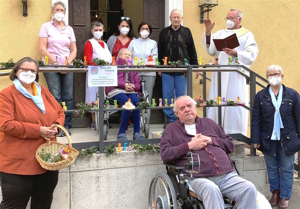 Auch in der Coronazeit werden die Bewohnerinnen und Bewohner in derDettelbacher Senioreneinrichtung mit hinein genommen in die liturgischen Feiern und Bräuche der Pfarrgemeinde. Zum Palmsonntag wurden vor dem Haupteingang im Beisein mehrere Bewohner und Mitarbeiter die vom Dettelbacher Frauenbund mitgebrachten Palmbüschelgesegnet. Ein 100 facher Ostergruß, bei dem die Grundschulkinder eifrig mitgewirkt hatten sowie gehäckelte Küken mit einer kleinen Süßigkeit wurden mit übergeben. Darüber freuen sich die Bewohner/innen und Mitarbeiter und auch auf den Ostermontagsgottesdienst in der Kapelle.